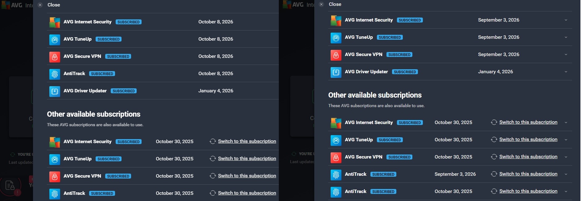 I just renewed my AVG Ultimate subscription… early. The previous subscription was to end on October 30, 2025, but after installing the update I got the following (see the left side of the image… this site won’t allow me to attach 2 files).