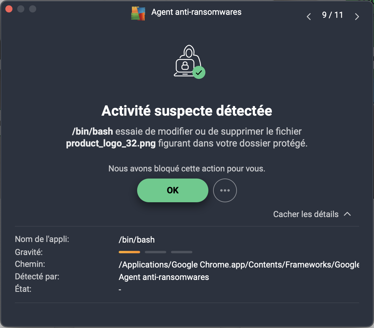 In the path /Applications/Google Chrome.app/Contents/Frameworks…. the Anti-ransomwares Agent detected a possible ransomware in the application /bin/bash trying to modify or delete the file product_logo_32.png.